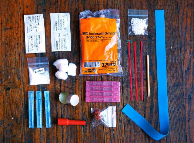 Without a supply of sterile injecting equipment, people who inject drugs are left to share supplies among their peers, multiplying the risk of hepatitis C or HIV and other health issues like abscesses and severe bacterial infections. Harm reduction organizations provide drug users with sterile injection supplies and a place to dispose their used needles. Four days a week, the San Francisco Drug Users Union distributes safe injections kits. These kits, packed into brown paper bags like elementary school lunches, comprise the necessary materials to shoot up safely: a ten pack of sterile needles, cookers, cotton swabs, waters, alcohol swipes, a tourniquet, cookers and vitamin C sachets.